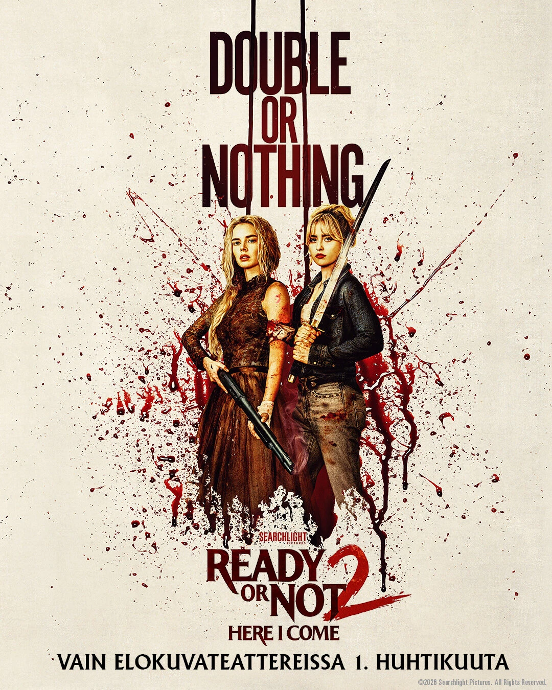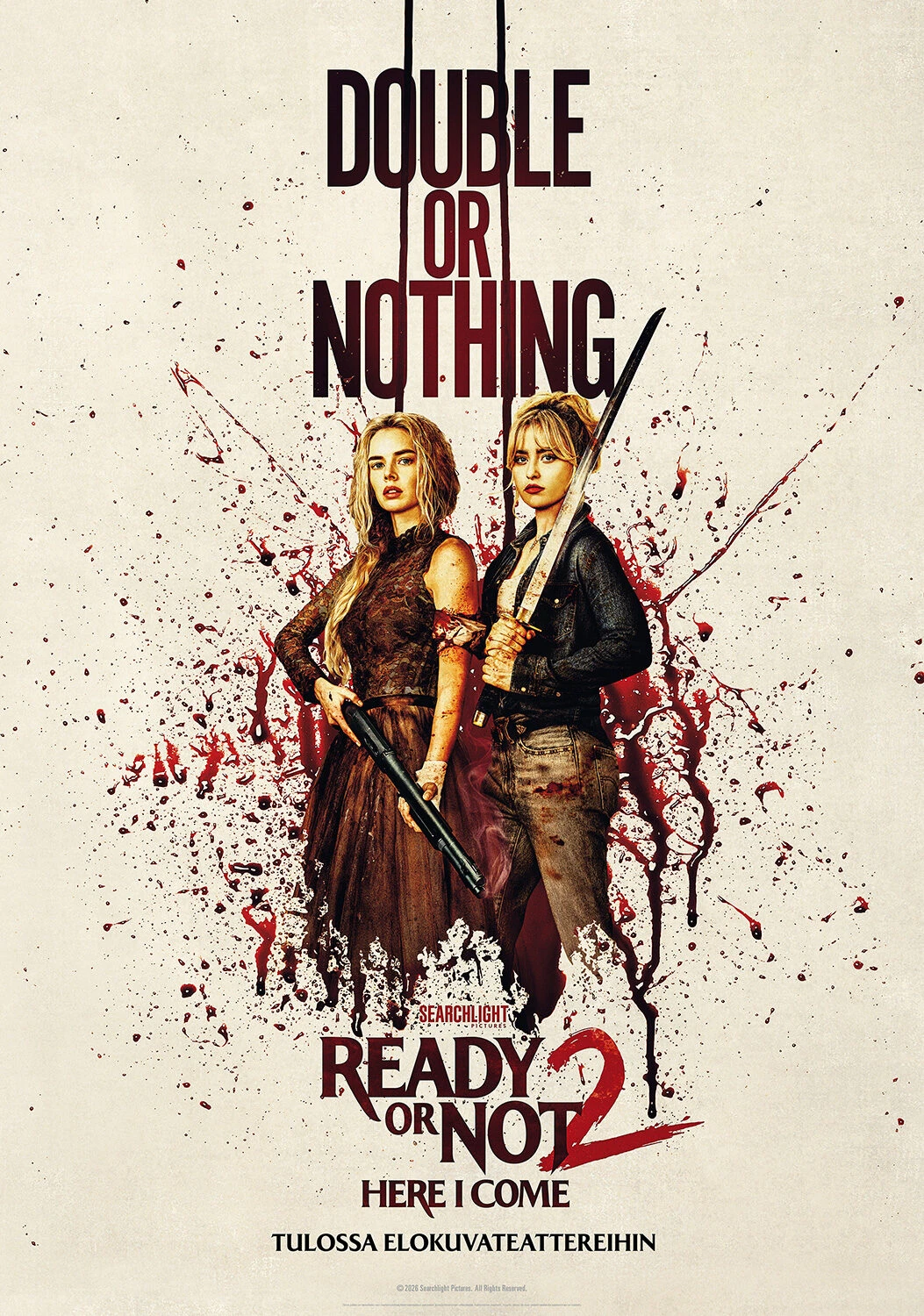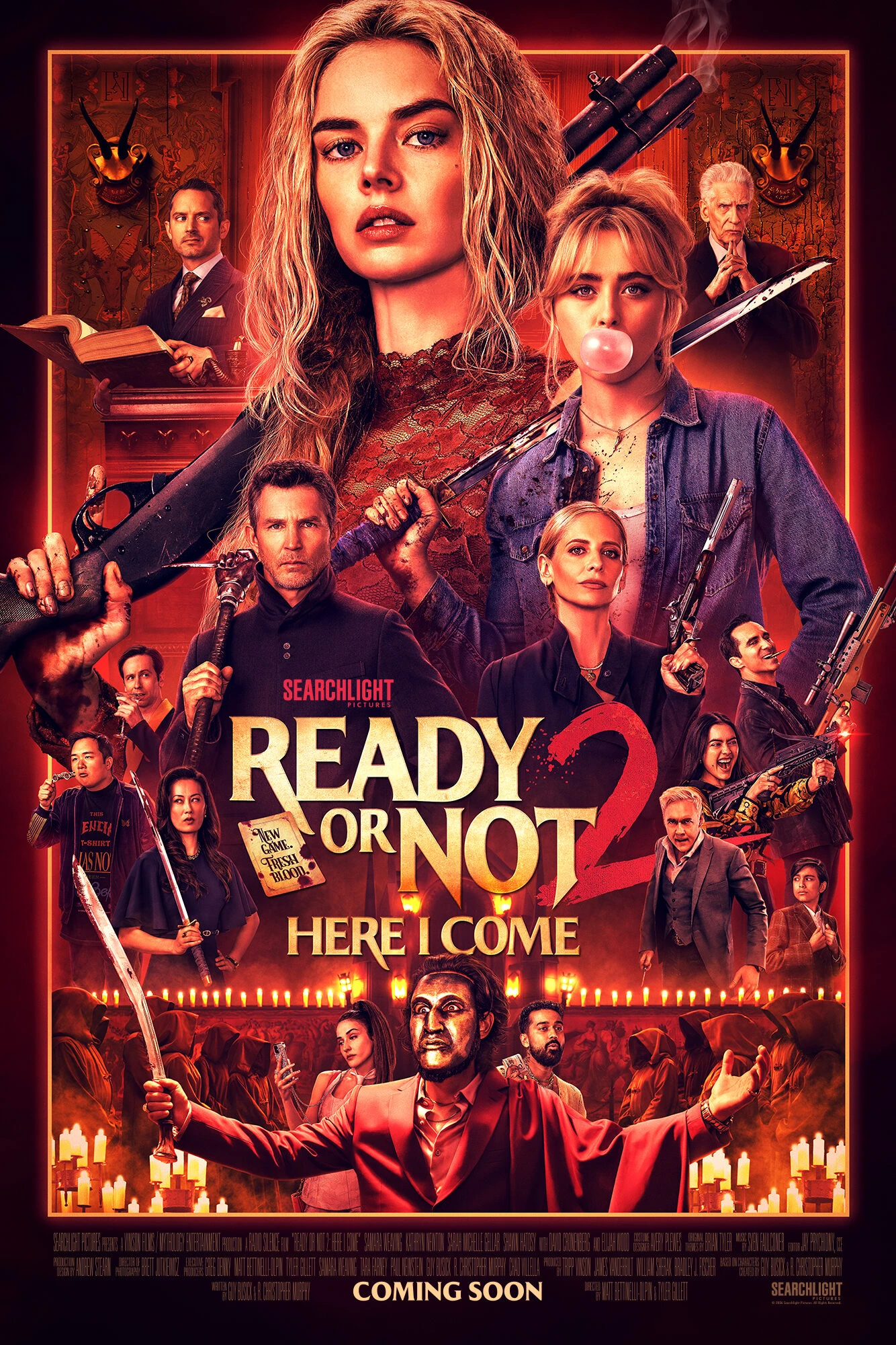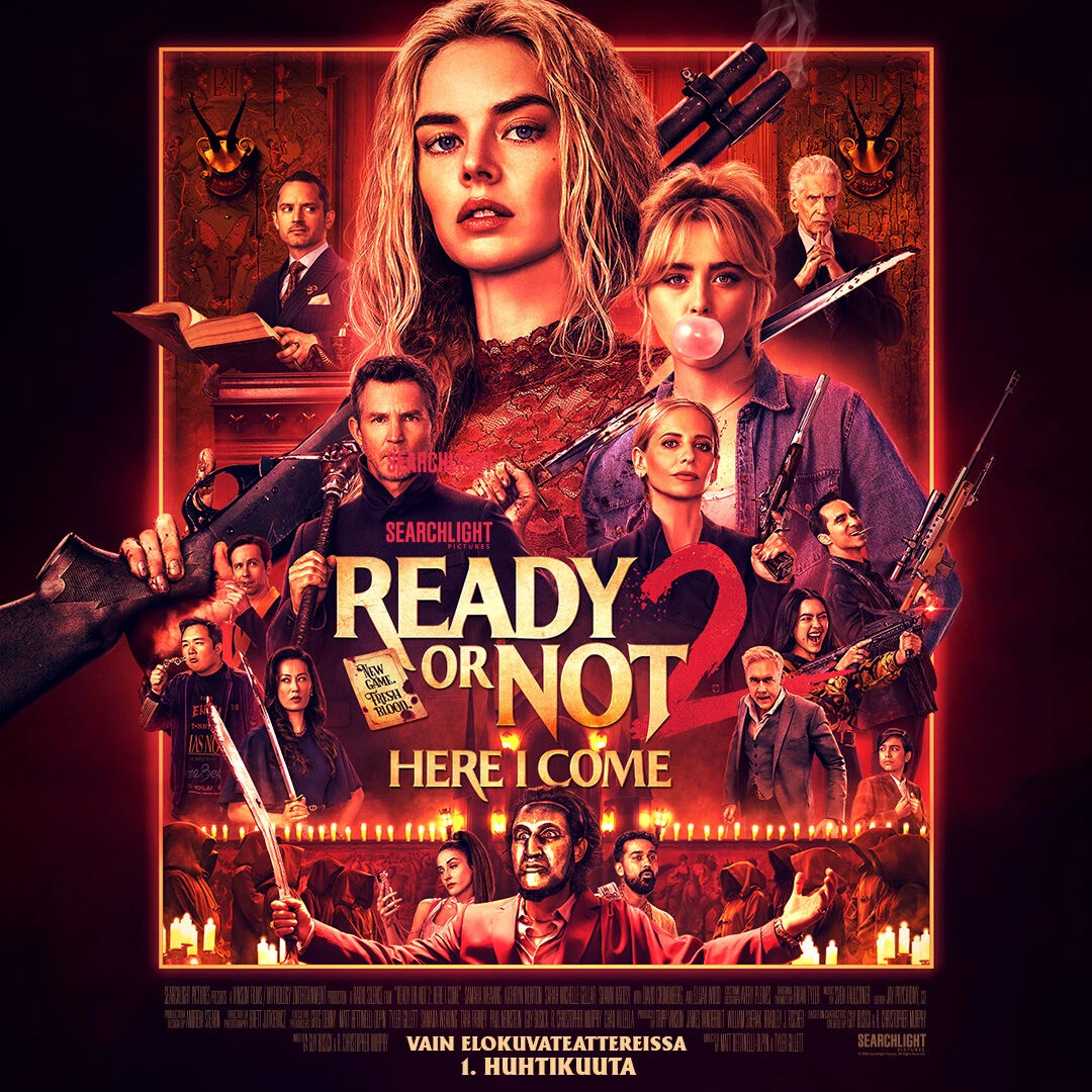 Samara Weaving (Ready or Not, Three Billboards Outside Ebbing, Missouri) palaa ‘Gracen’ rooliin Matt Bettinelli-Olpinin ja Tyler Gillettin ohjaamassa (Ready or Not, Scream VI, Abigail, tulevat The Mummy -elokuvat) jatko-osassa READY OR NOT 2: HERE I COME. Elokuvasarjaan liittyvät mukaan Kathryn Newton (Ant-Man and the Wasp: Quantumania, Abigail, Big Little Lies), Sarah Michelle Gellar (Julmia aikeita, Tiedän mitä teit viime kesänä, Buffy vampyyrintappaja), Shawn Hatosy (The Pitt) ja Elijah Wood (The Monkey). Muissa rooleissa nähdään Néstor Carbonell (Yön ritari), Kevin Durand (Abigail) ja David Cronenberg (Kärpänen). Käsikirjoittajiksi palaavat Guy Busick (Abigail, Scream) ja R. Christopher Murphy (Castle Rock) sekä tuottajiksi Tripp Vinson (Fountain of Youth, Murhamysteeri), James Vanderbilt (Zodiac, Fountain of Youth), Bradley J. Fischer (Transformers) ja William Sherak (Abigail, Scream).